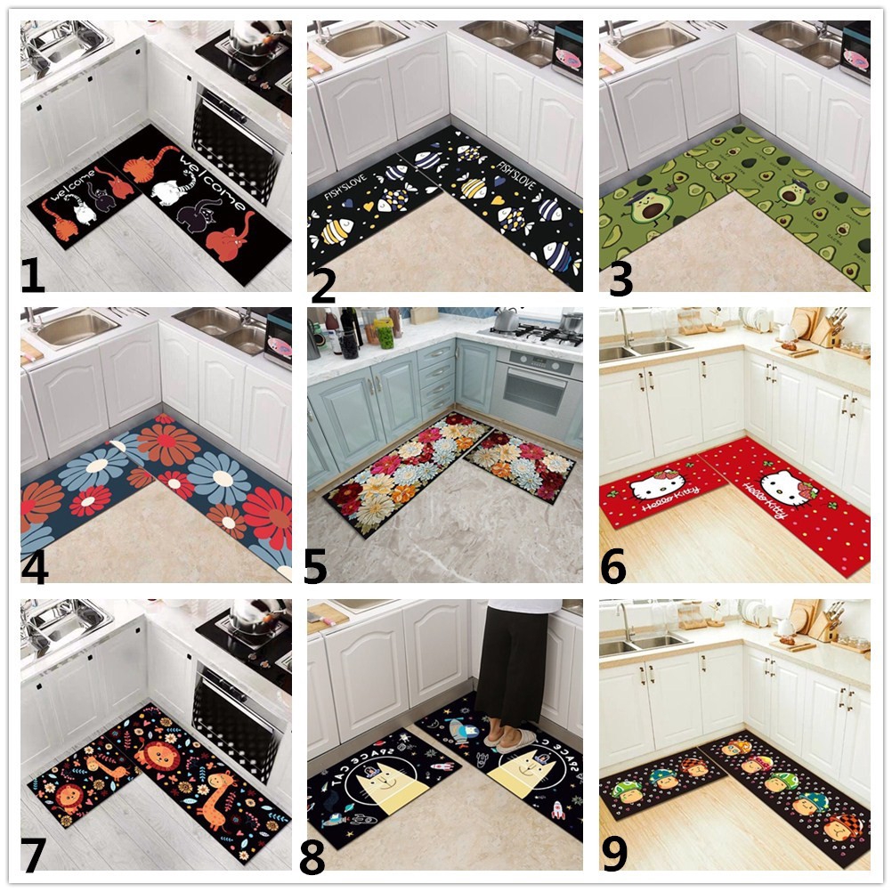 2pcs Set Black Cartoon Printed Kitchen Floor Mats Anti Slip Living